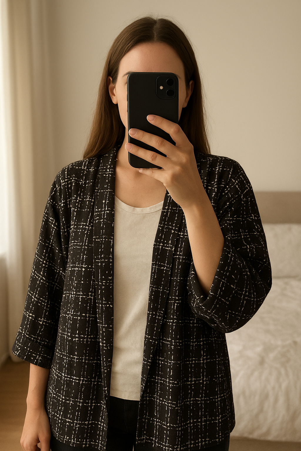 SHEIN curves 1XL black and white blazer with waterfall effect front and rouge sleeves standing straight facing the camera, in a softly lit bedroom setting, with gentle natural light filtering through a window.