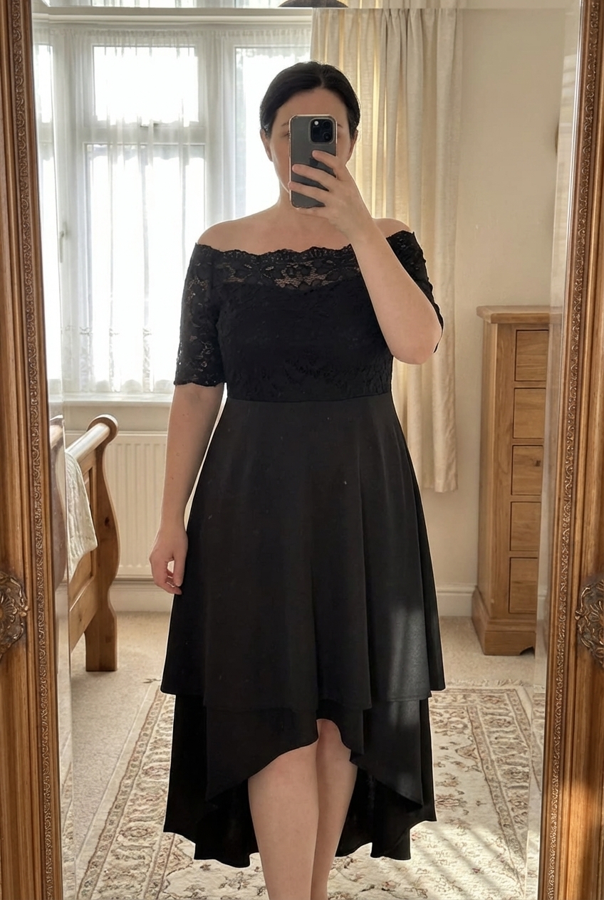 SHEIN Off the Shoulders black dress (high - low hem) - 1X standing straight facing the camera, in a softly lit bedroom setting, with gentle natural light filtering through a window.