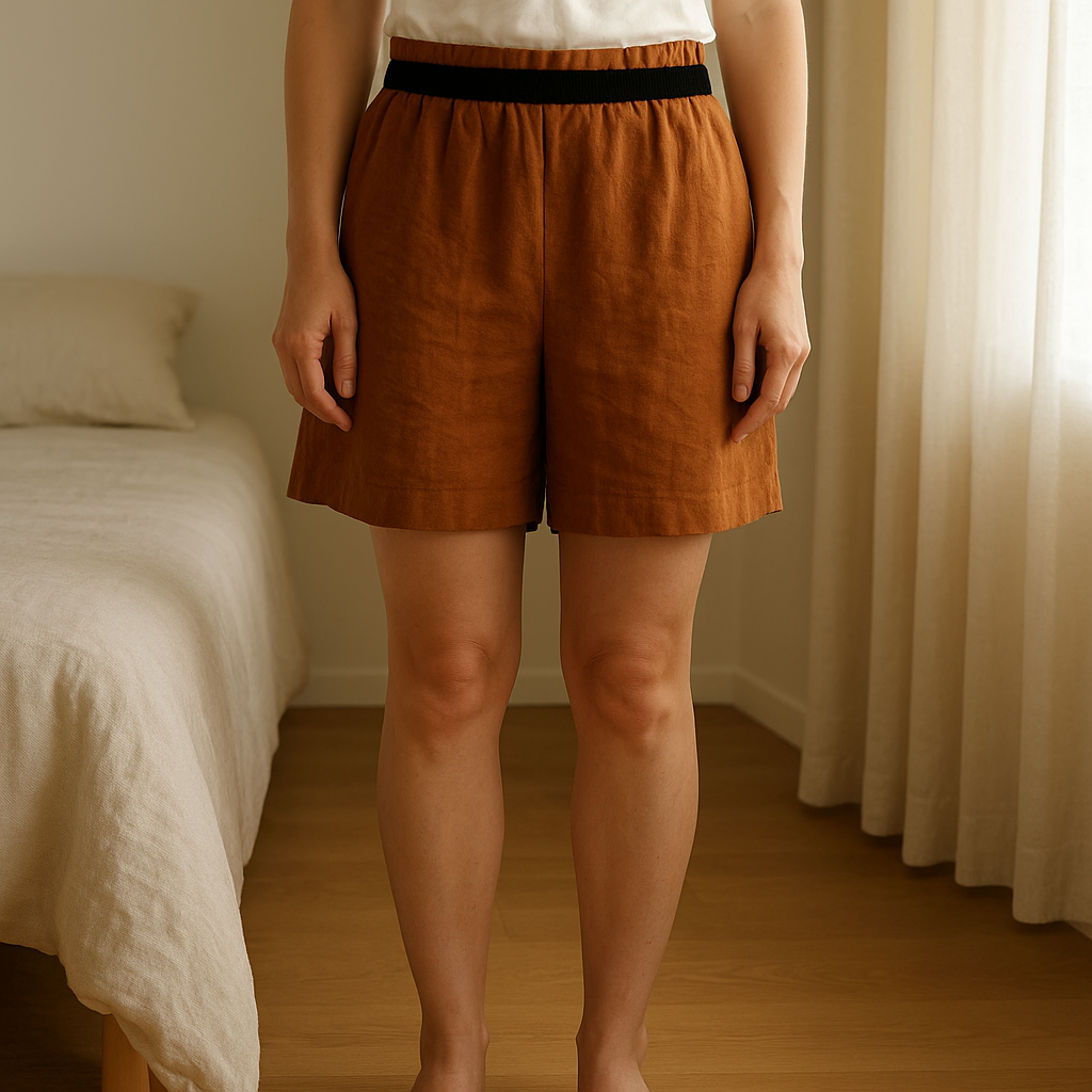short Karl marc john T36 debout, face à la caméra, dans une chambre à la lumière douce, avec une lumière naturelle filtrant par la fenêtre.