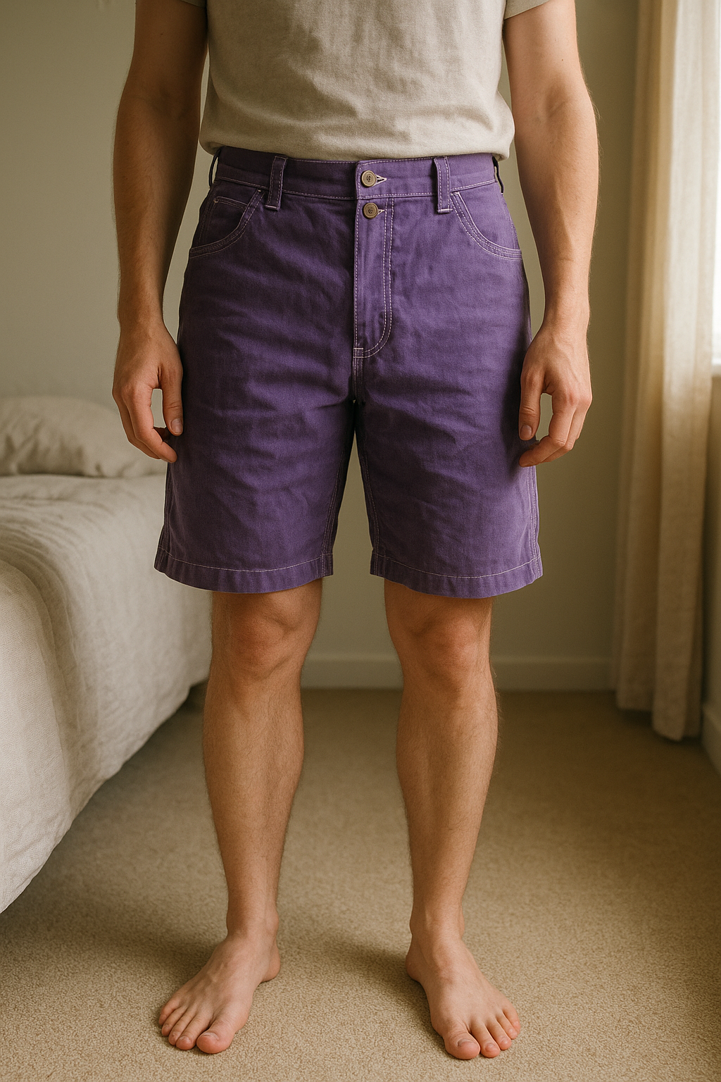 Short long vintage violet jort debout, face à la caméra, dans une chambre à la lumière douce, avec une lumière naturelle filtrant par la fenêtre.