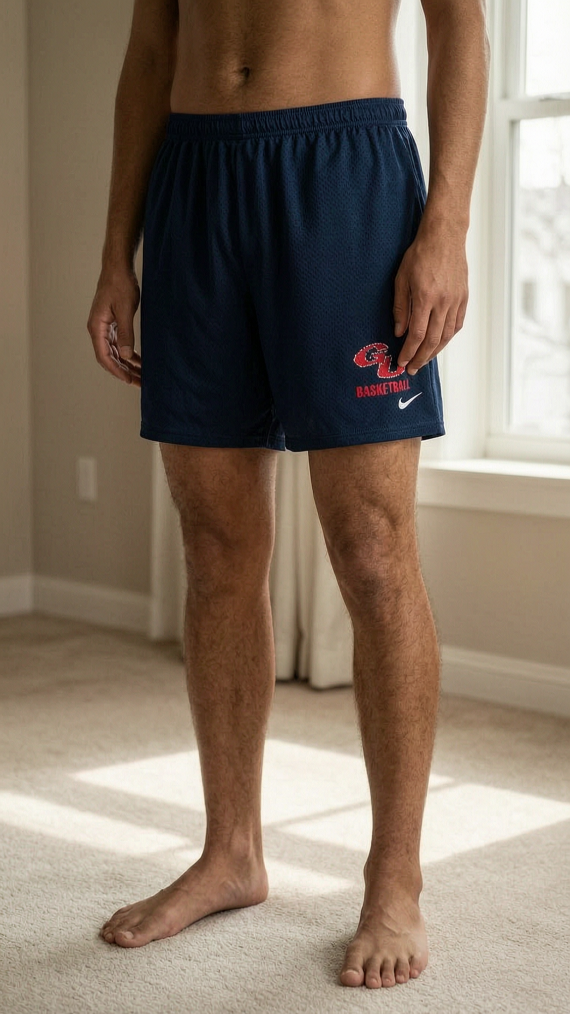 Une personne en Short Nike Team bleu taille M debout, face à la caméra, dans une chambre à la lumière douce, avec une lumière naturelle filtrant par la fenêtre.