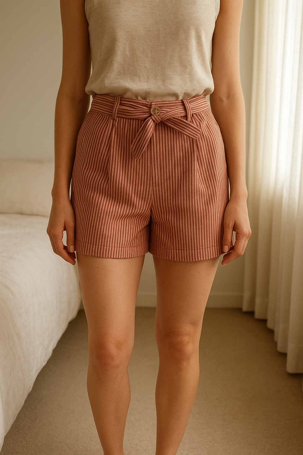 Short à rayures debout, face à la caméra, dans une chambre à la lumière douce, avec une lumière naturelle filtrant par la fenêtre.
