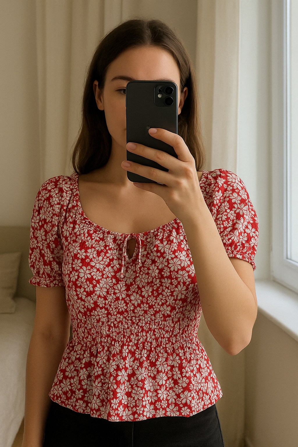 Short sleeve top standing straight facing the camera, in a softly lit bedroom setting, with gentle natural light filtering through a window.