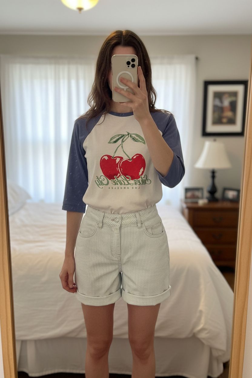 Shorts and Top combo size 6/8 River Island/Next 90’s vibe standing straight facing the camera, in a softly lit bedroom setting, with gentle natural light filtering through a window.