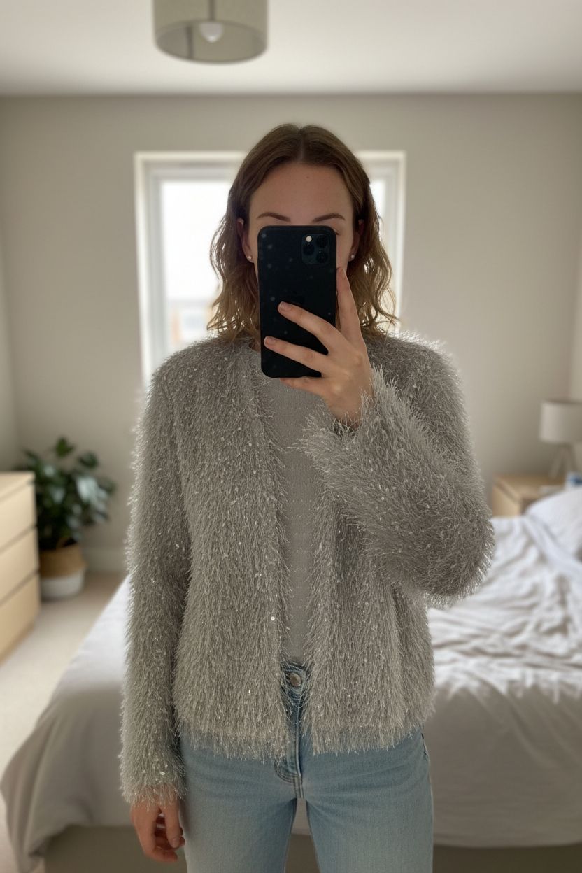 Silver grey textured evening jacket/ cardigan standing straight facing the camera, in a softly lit bedroom setting, with gentle natural light filtering through a window.