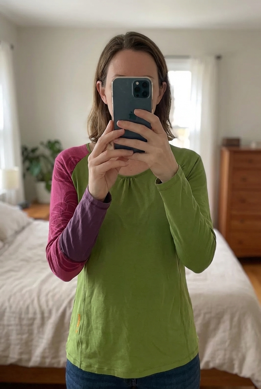 Simond long sleeved outdoor activewear top perfect for camping etc in this seasons bright colours standing straight facing the camera, in a softly lit bedroom setting, with gentle natural light filtering through a window.