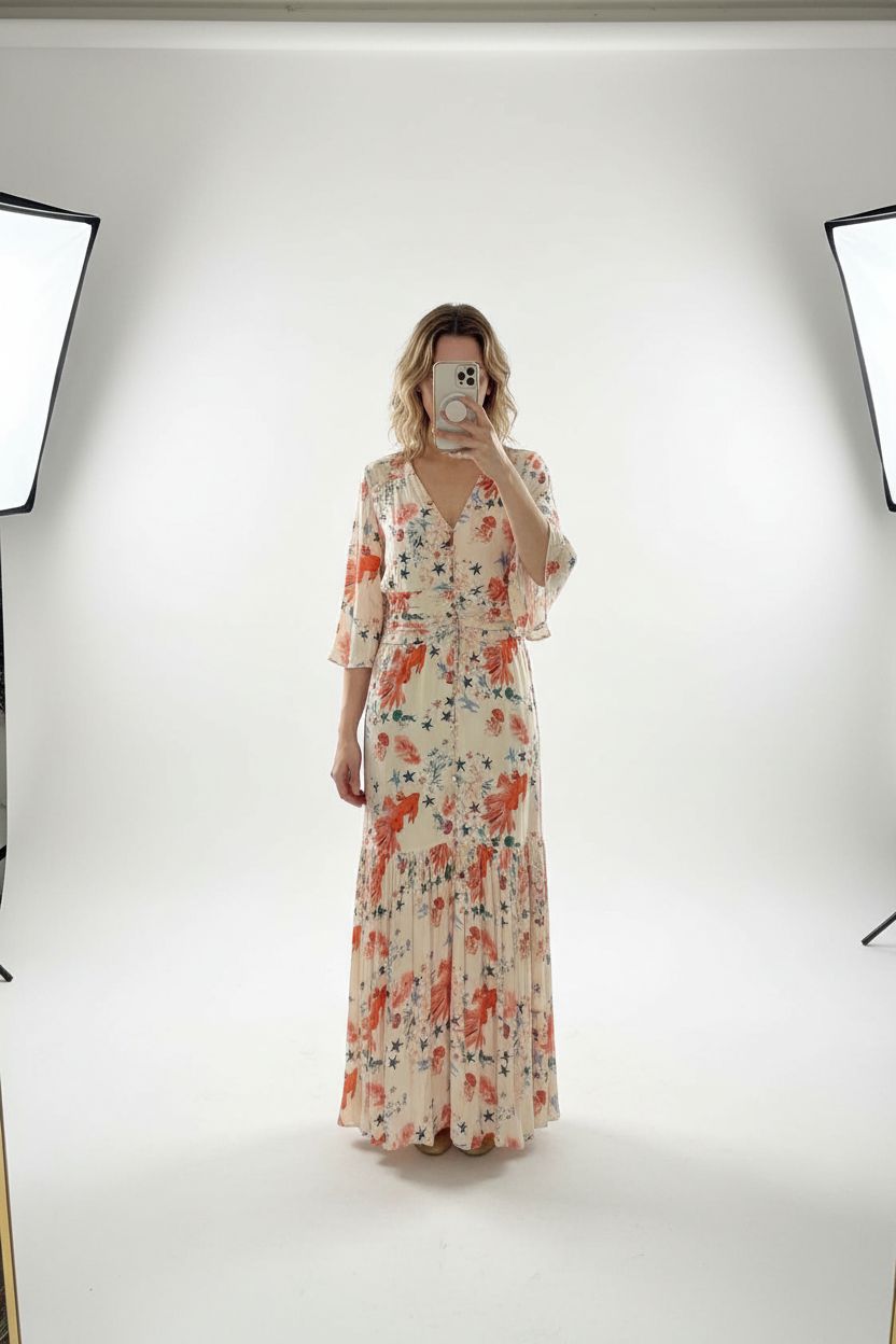 A person in Sirens Goldfish patterned dress 10 standing straight facing the camera, in a clean photo studio with seamless white backdrop and softbox lighting.