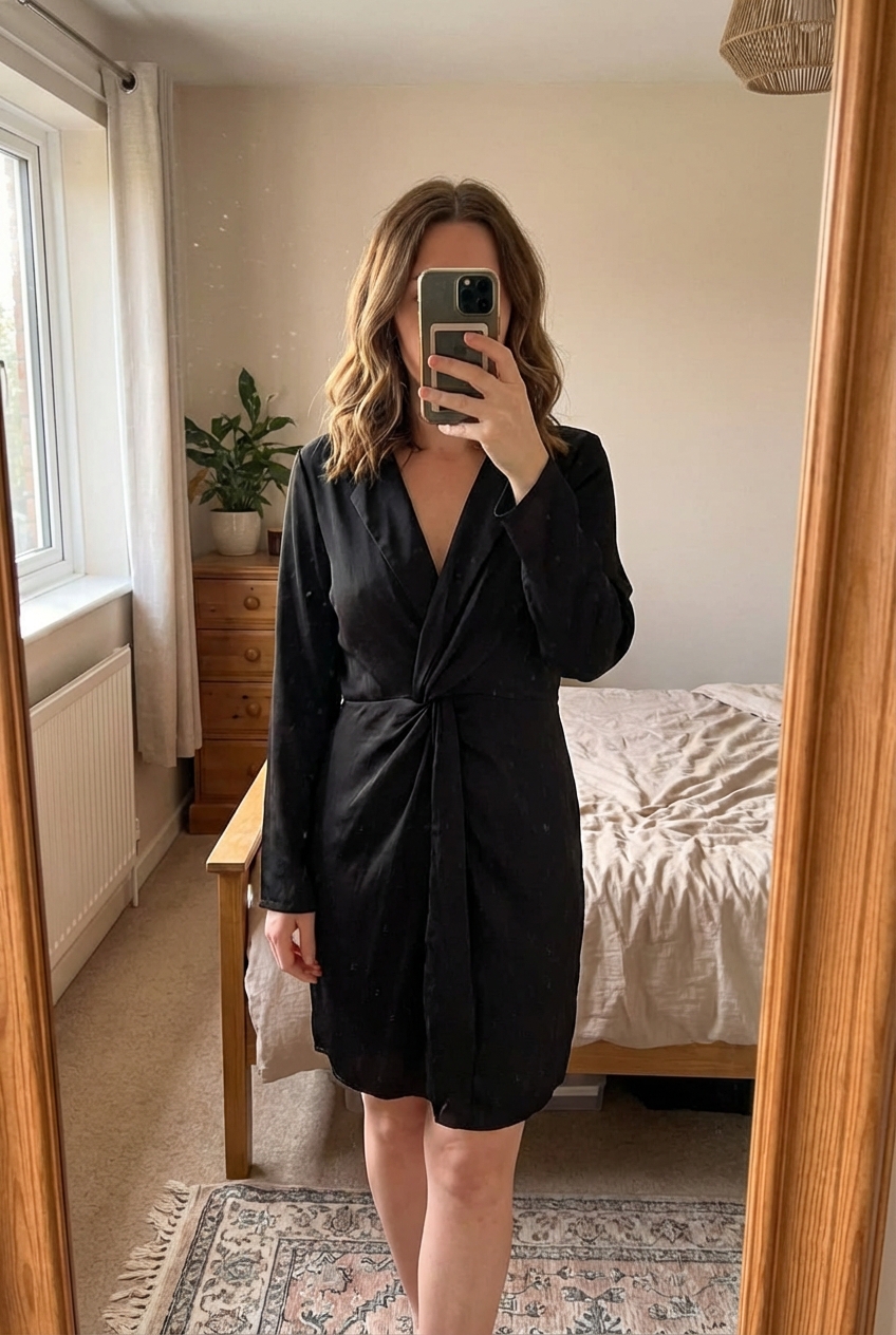 Sistaglam silky black dress with collar size 12 standing straight facing the camera, in a softly lit bedroom setting, with gentle natural light filtering through a window.