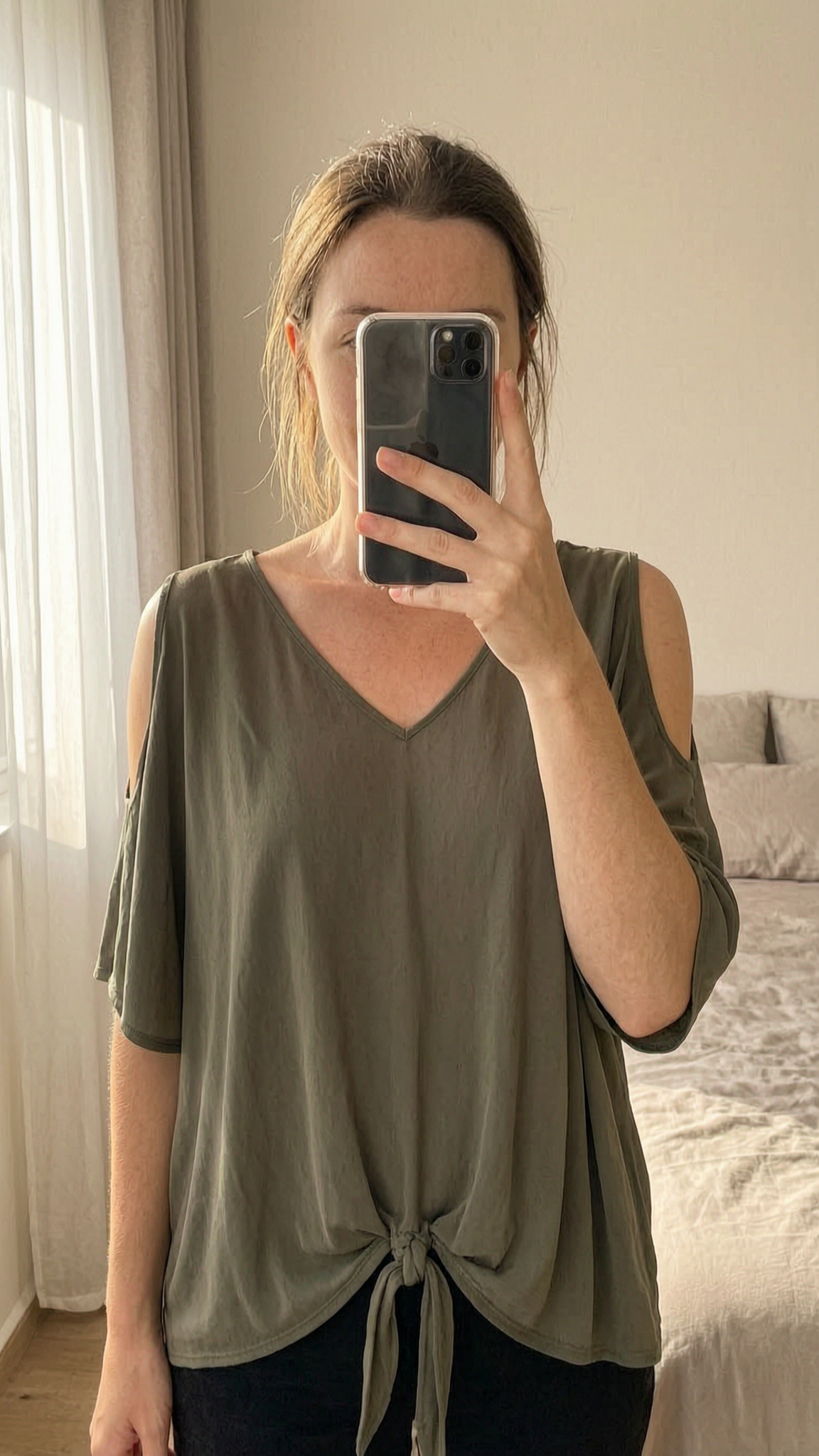 Size 18 top with cold-shoulders standing straight facing the camera, in a softly lit bedroom setting, with gentle natural light filtering through a window.