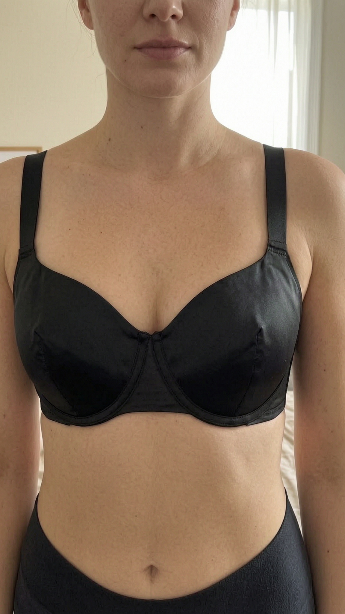 Skims Black Balconette Bra Size 36DD standing straight facing the camera, in a softly lit bedroom setting, with gentle natural light filtering through a window.