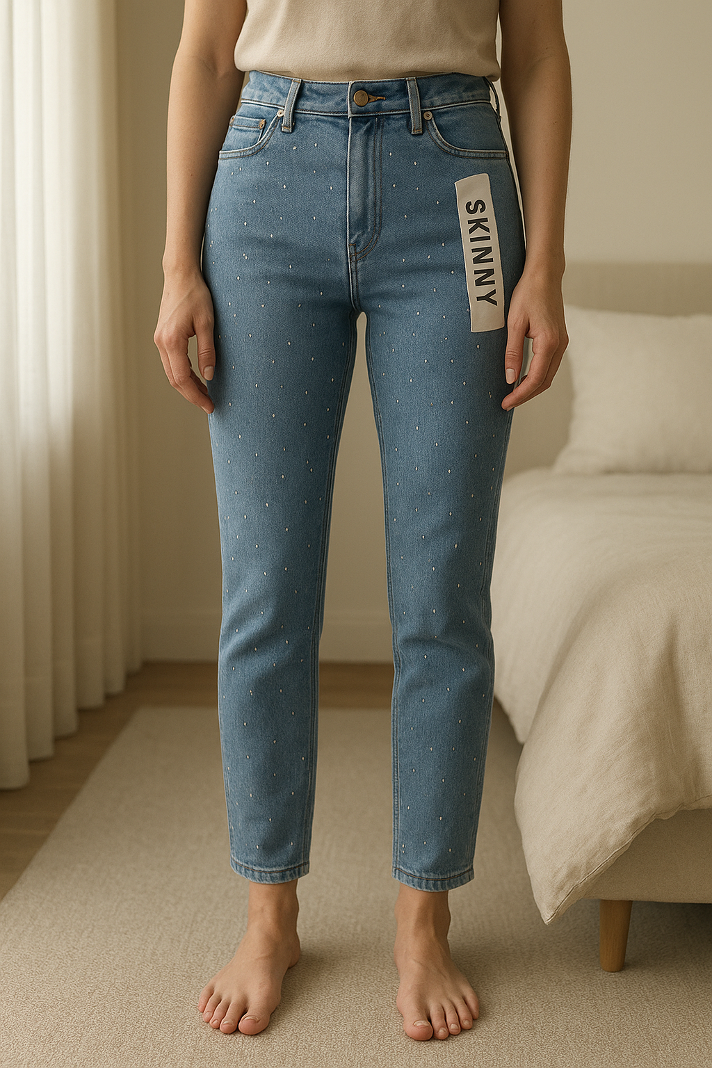 Skinny Jeans - Soft Stretch size 14 Sparkly standing straight facing the camera, in a softly lit bedroom setting, with gentle natural light filtering through a window.