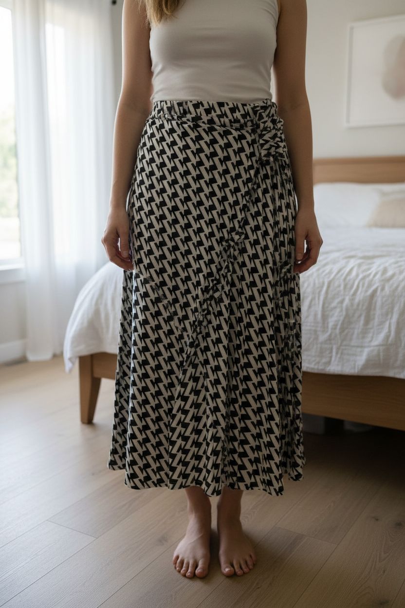 Skirt by Boohoo standing straight facing the camera, in a softly lit bedroom setting, with gentle natural light filtering through a window.