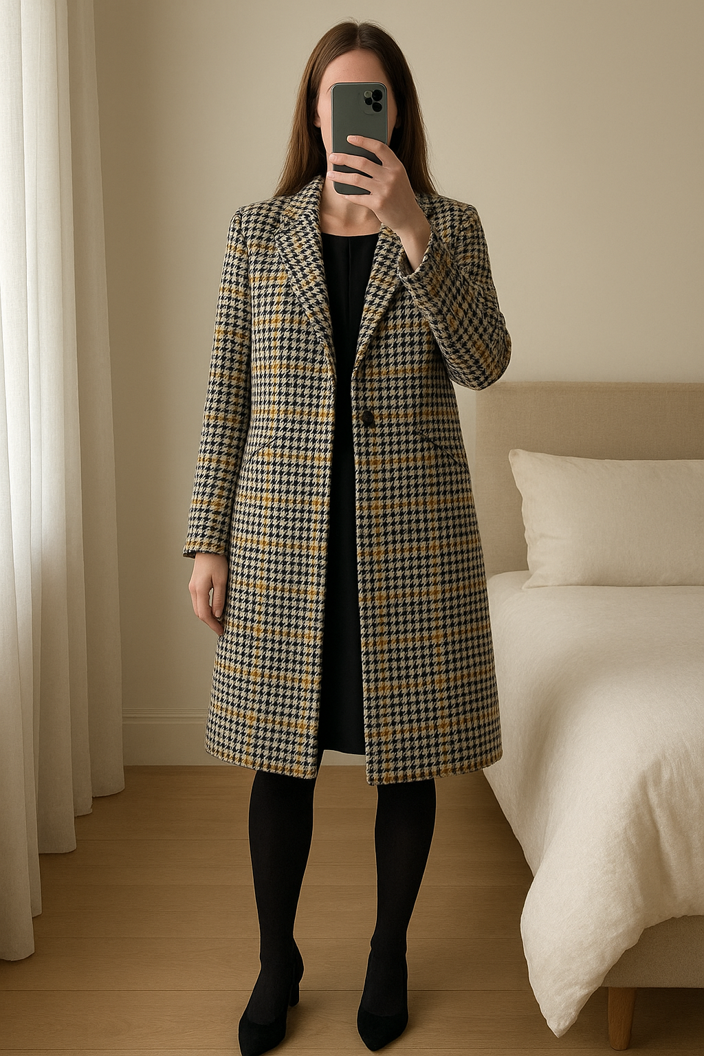 Smart winter coat worn once size 14 standing straight facing the camera, in a softly lit bedroom setting, with gentle natural light filtering through a window.