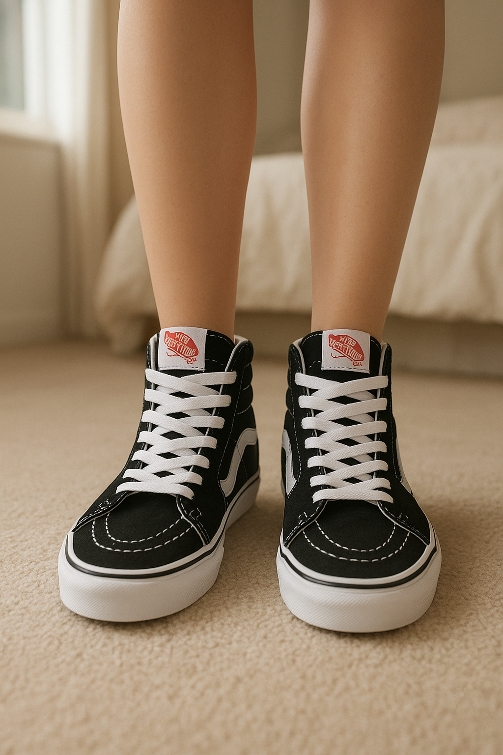 Sneakers Vans Sk8-Hi stickers debout, face à la caméra, dans une chambre à la lumière douce, avec une lumière naturelle filtrant par la fenêtre.