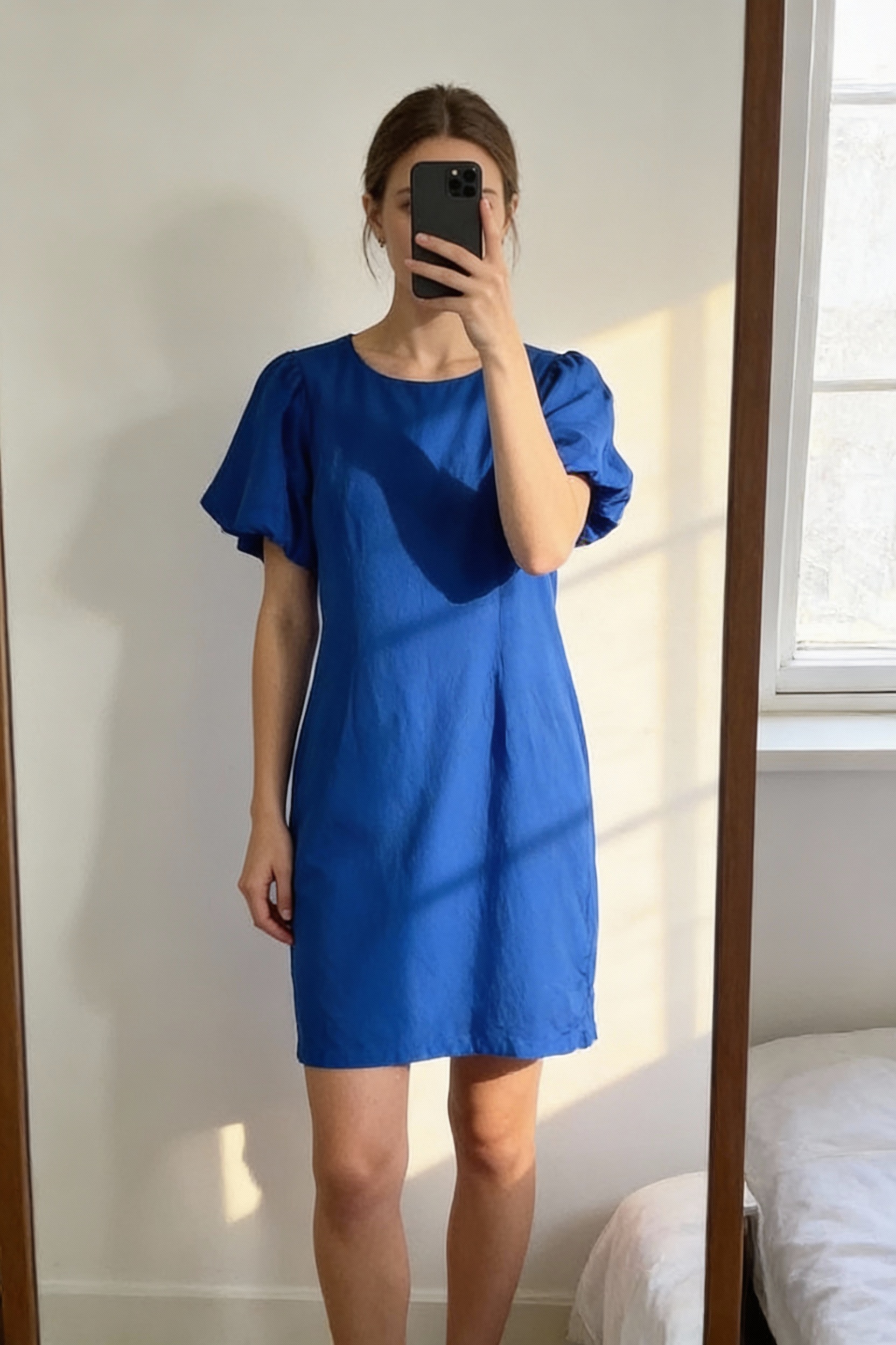 Sosander stylish linen dress with balloon sleeve detail size 10 standing straight facing the camera, in a softly lit bedroom setting, with gentle natural light filtering through a window.
