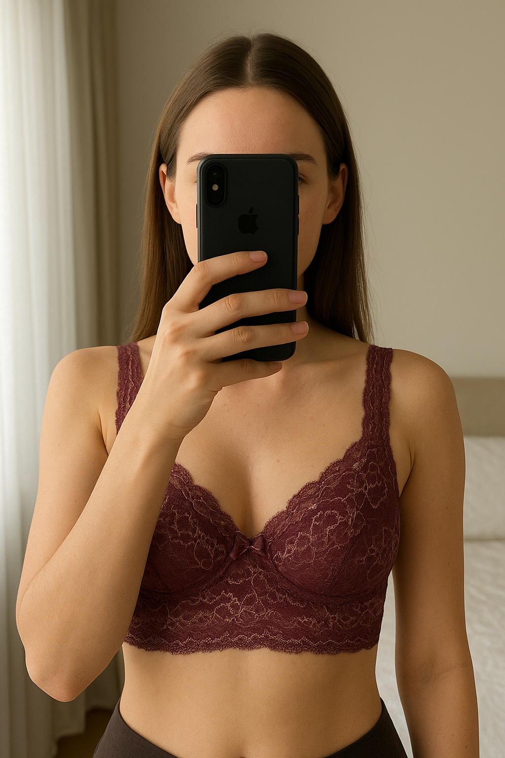 Soutien-gorge Anne Weyburn debout, face à la caméra, dans une chambre à la lumière douce, avec une lumière naturelle filtrant par la fenêtre.
