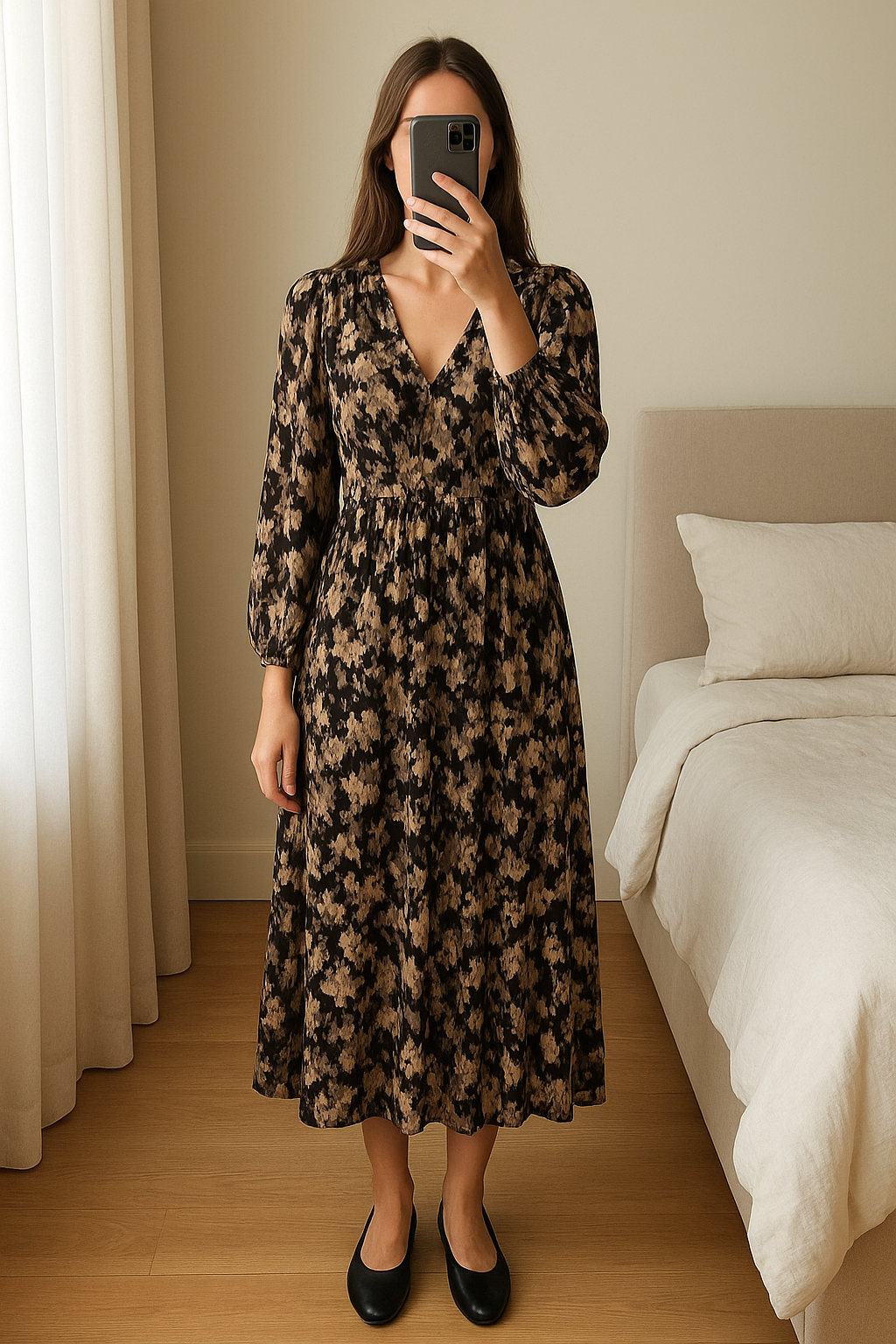 Soyaconcept Maxi Dress standing straight facing the camera, in a softly lit bedroom setting, with gentle natural light filtering through a window.
