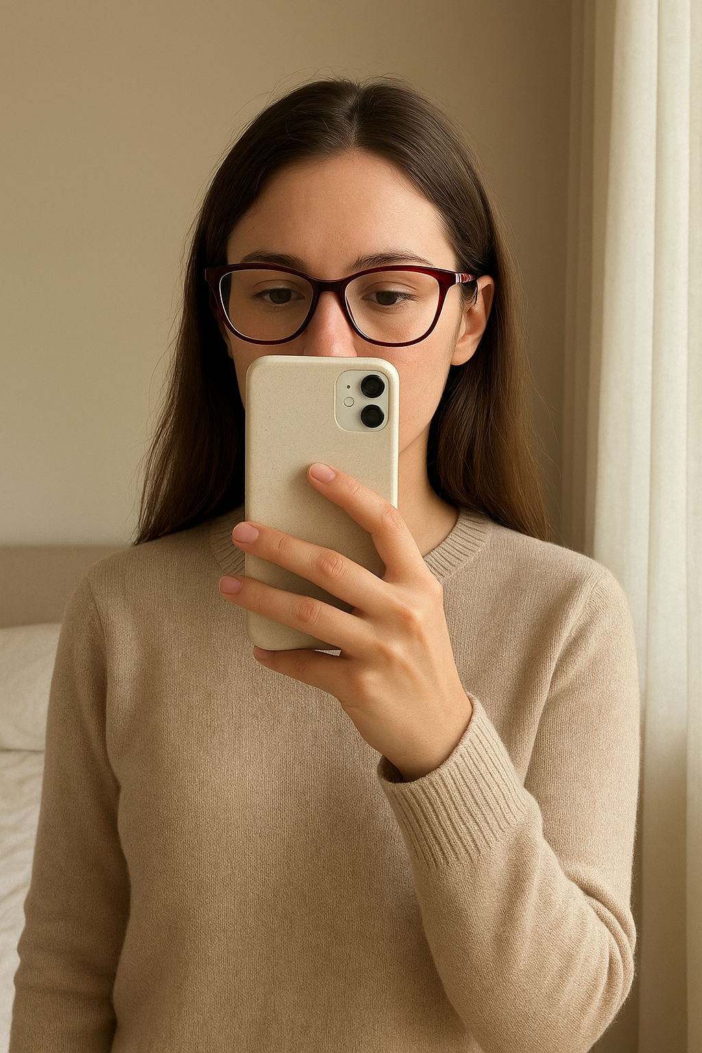 Specsavers Blossom Glasses Frames standing straight facing the camera, in a softly lit bedroom setting, with gentle natural light filtering through a window.