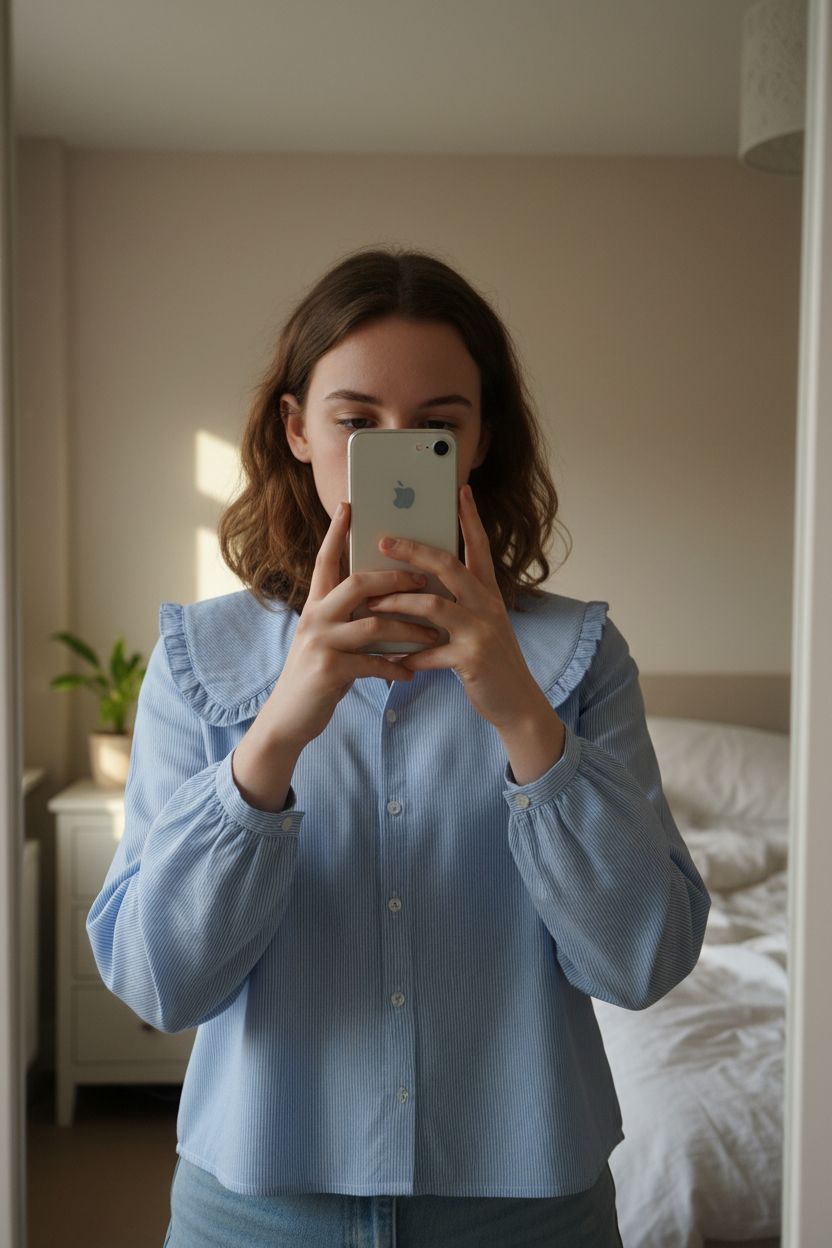 Striped Peter pan collar blouse standing straight facing the camera, in a softly lit bedroom setting, with gentle natural light filtering through a window.