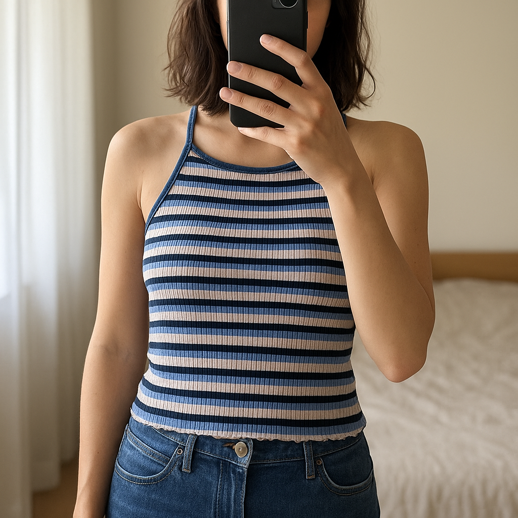 Stripped Vest Top standing straight facing the camera, in a softly lit bedroom setting, with gentle natural light filtering through a window.