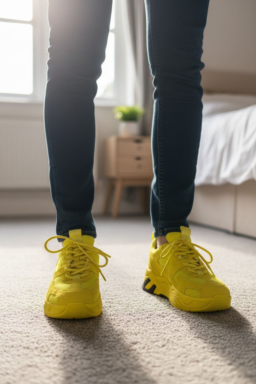 Strut Your Stuff: Marcelo Burlon C-Run 3000 Lime Black Kicks! standing straight facing the camera, in a softly lit bedroom setting, with gentle natural light filtering through a window.