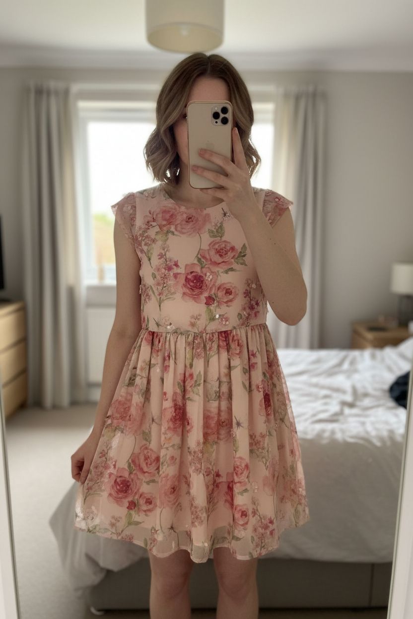 Stunning Next Girls Floral Sequin Dress Age 10 years standing straight facing the camera, in a softly lit bedroom setting, with gentle natural light filtering through a window.