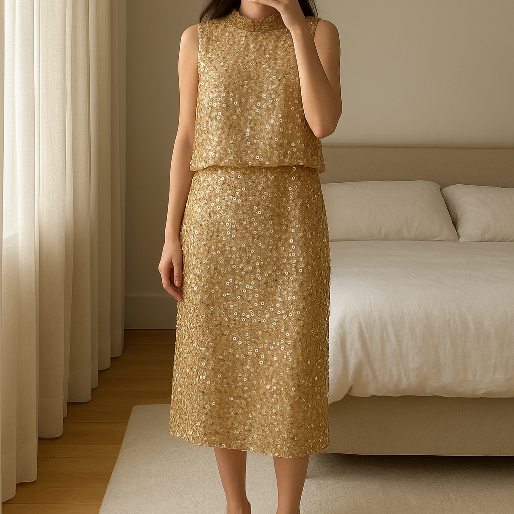Stunning sequin special occasion champagne gold dress Monsoon 14 standing straight facing the camera, in a softly lit bedroom setting, with gentle natural light filtering through a window.