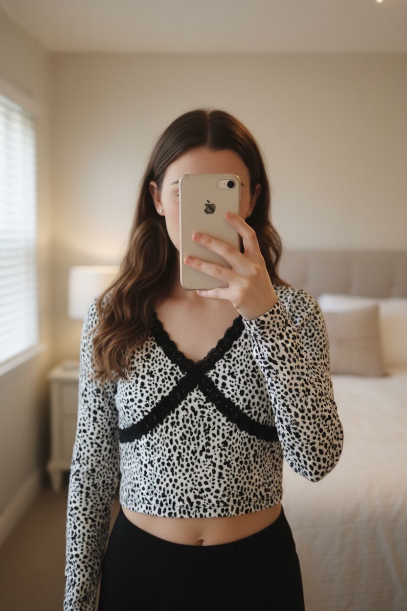 Subdued black & white top size S leopard/dalmation print crop lace long sleeve standing straight facing the camera, in a softly lit bedroom setting, with gentle natural light filtering through a window.