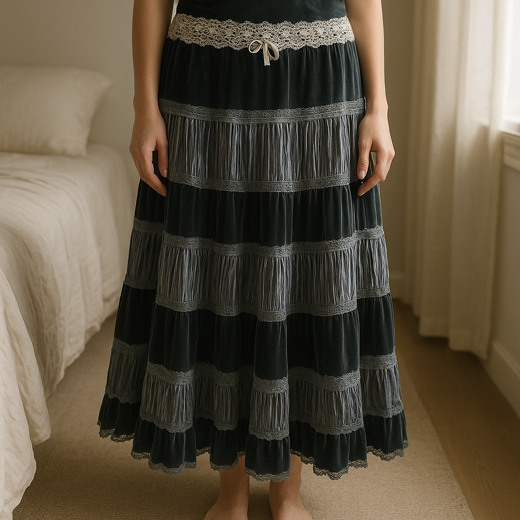 Sublime jupe longue dentelle et velour satiné debout, face à la caméra, dans une chambre à la lumière douce, avec une lumière naturelle filtrant par la fenêtre.