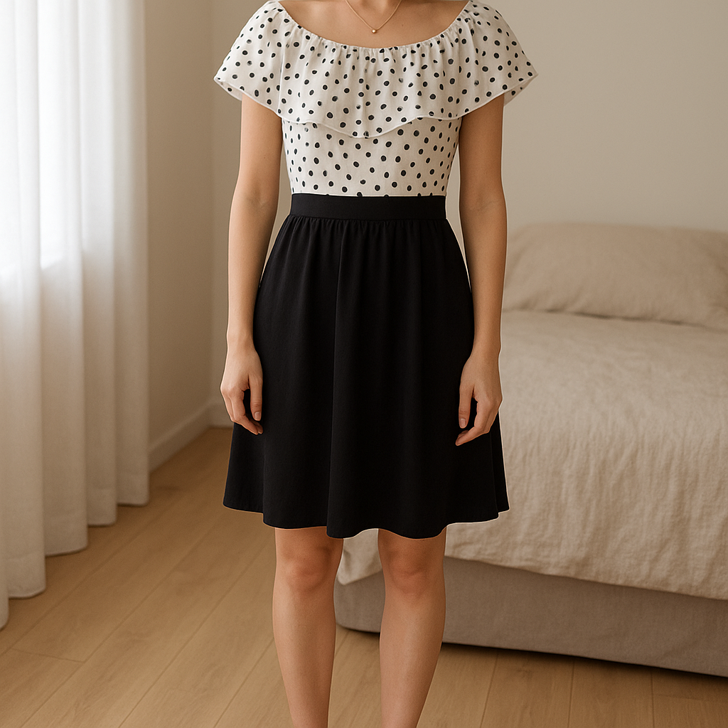 Sukienka w kropki vintage xs standing straight facing the camera, in a softly lit bedroom setting, with gentle natural light filtering through a window.