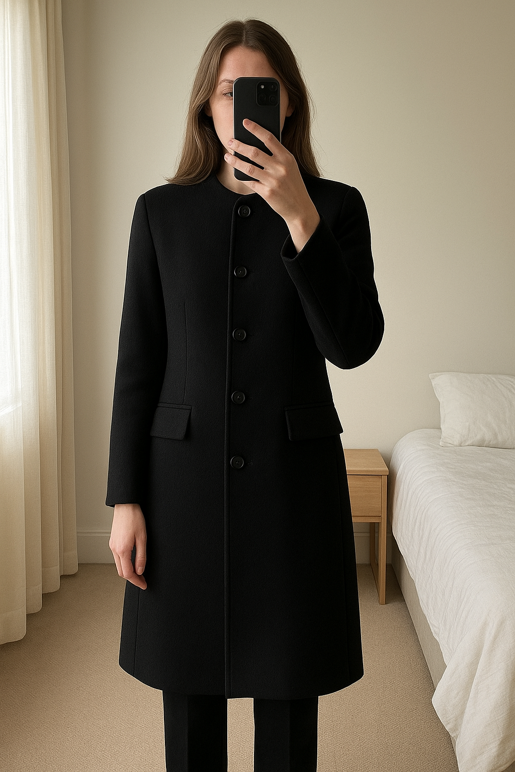 superbe manteau noir droit best mountain Taille L debout, face à la caméra, dans une chambre à la lumière douce, avec une lumière naturelle filtrant par la fenêtre.