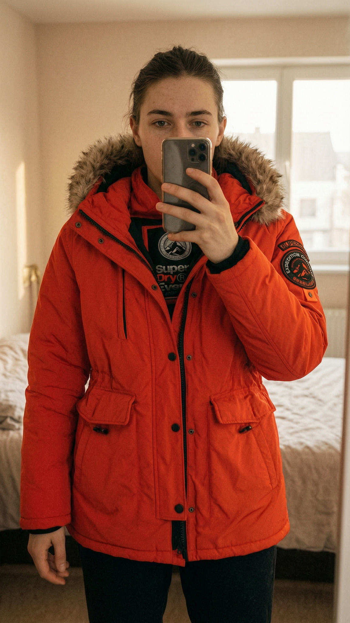 Superdry Everest Parker Coat standing straight facing the camera, in a softly lit bedroom setting, with gentle natural light filtering through a window.
