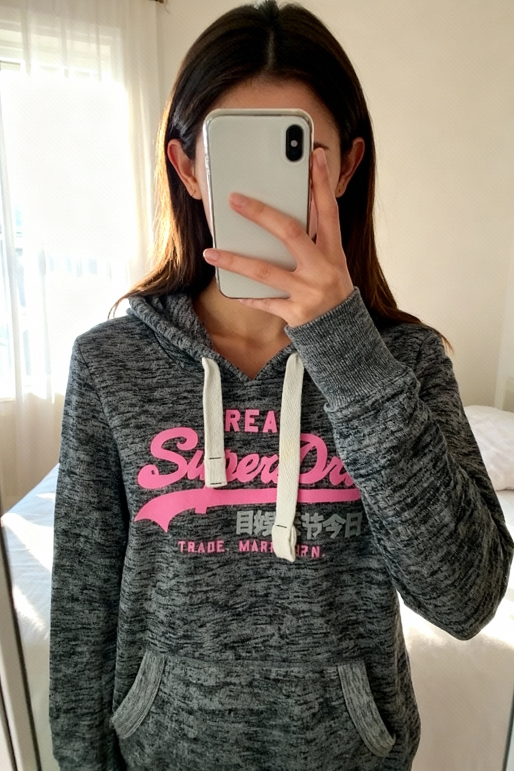Superdry hoodie standing straight facing the camera, in a softly lit bedroom setting, with gentle natural light filtering through a window.