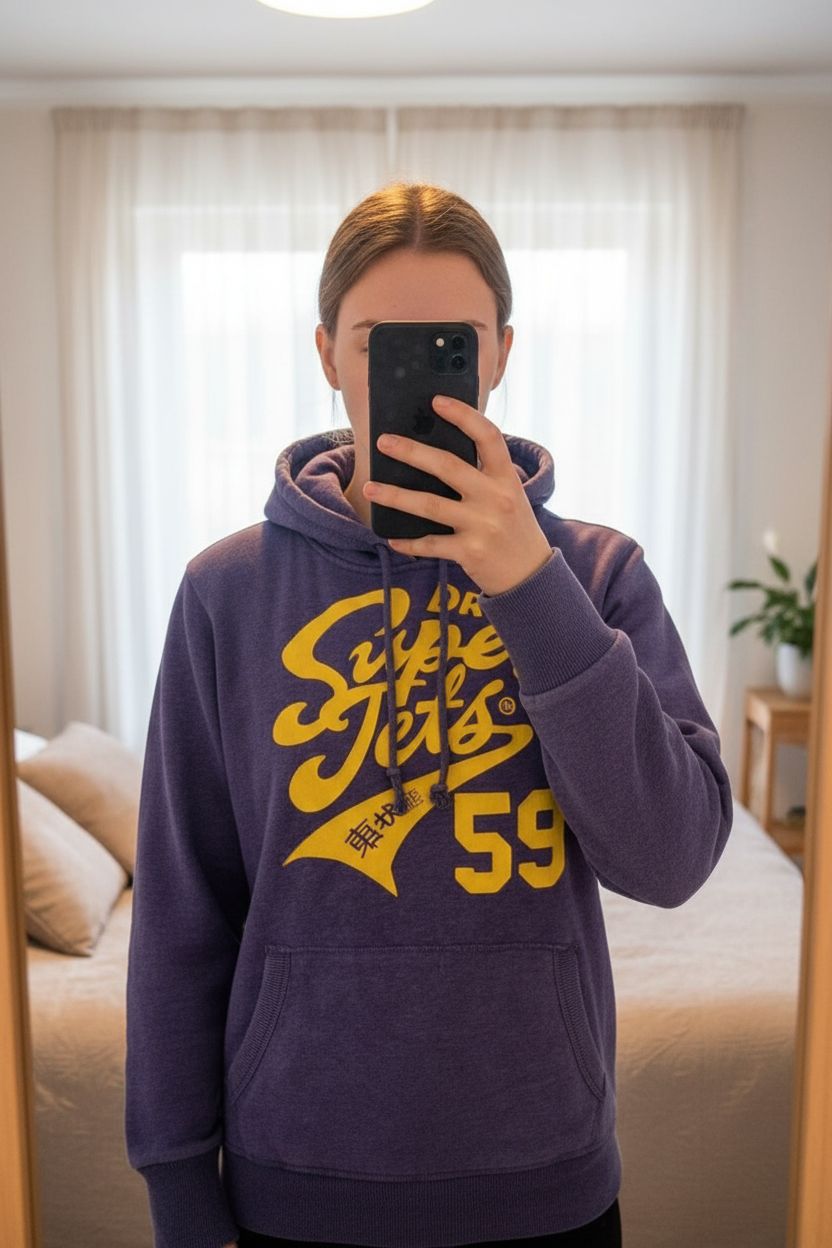 Superdry Vintage Hoodie Purple Logo Sweatshirt UK Large Retro Varsity Casual standing straight facing the camera, in a softly lit bedroom setting, with gentle natural light filtering through a window.