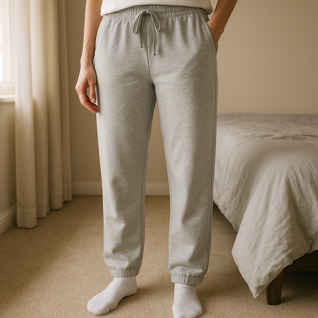 Svetlosivé rovné tepláky standing straight facing the camera, in a softly lit bedroom setting, with gentle natural light filtering through a window.