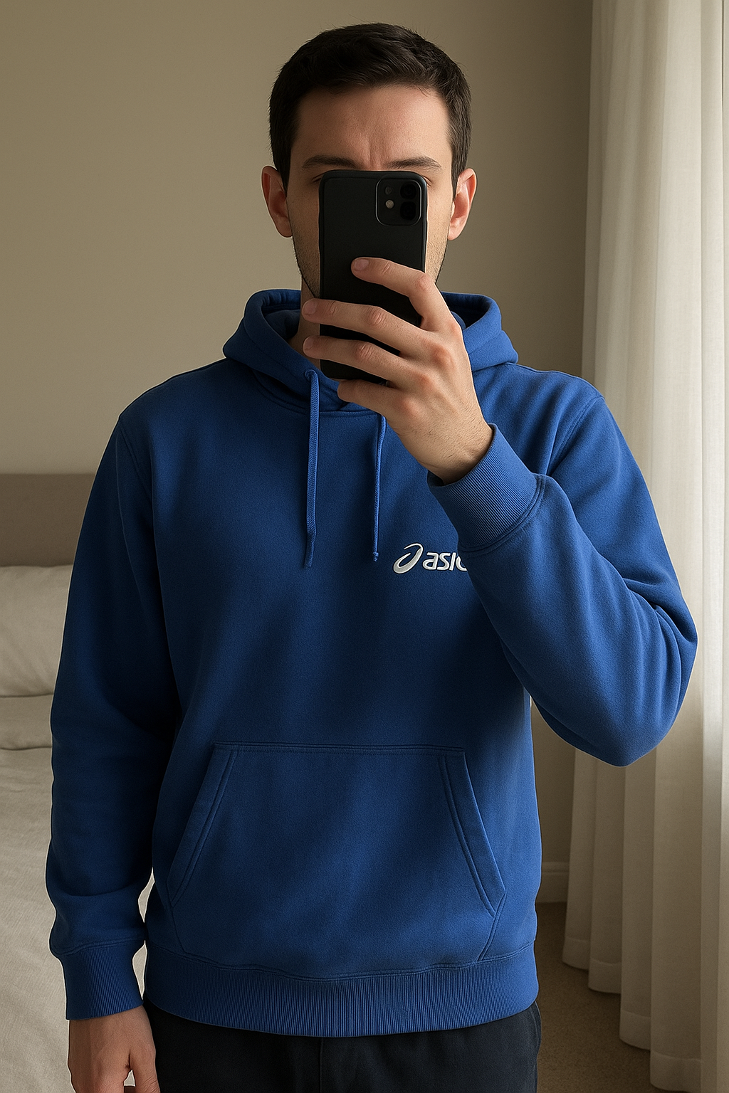 Sweat Asics Hoodie debout, face à la caméra, dans une chambre à la lumière douce, avec une lumière naturelle filtrant par la fenêtre.