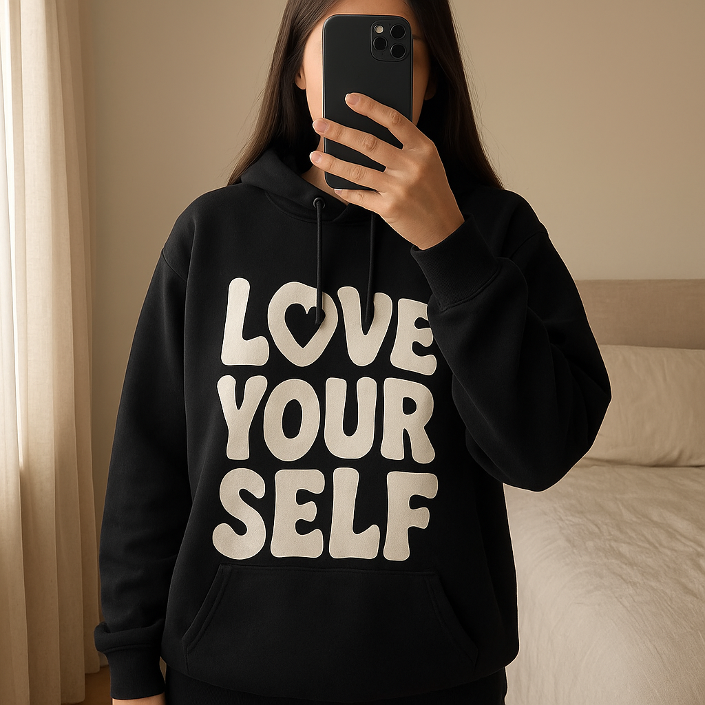 sweat à capuche debout, face à la caméra, dans une chambre à la lumière douce, avec une lumière naturelle filtrant par la fenêtre.