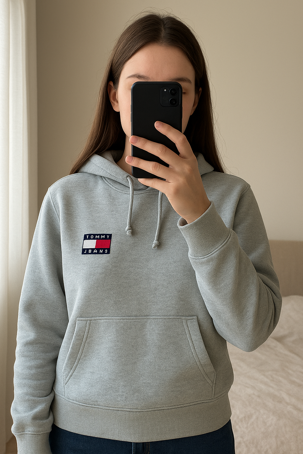Sweat à capuche debout, face à la caméra, dans une chambre à la lumière douce, avec une lumière naturelle filtrant par la fenêtre.