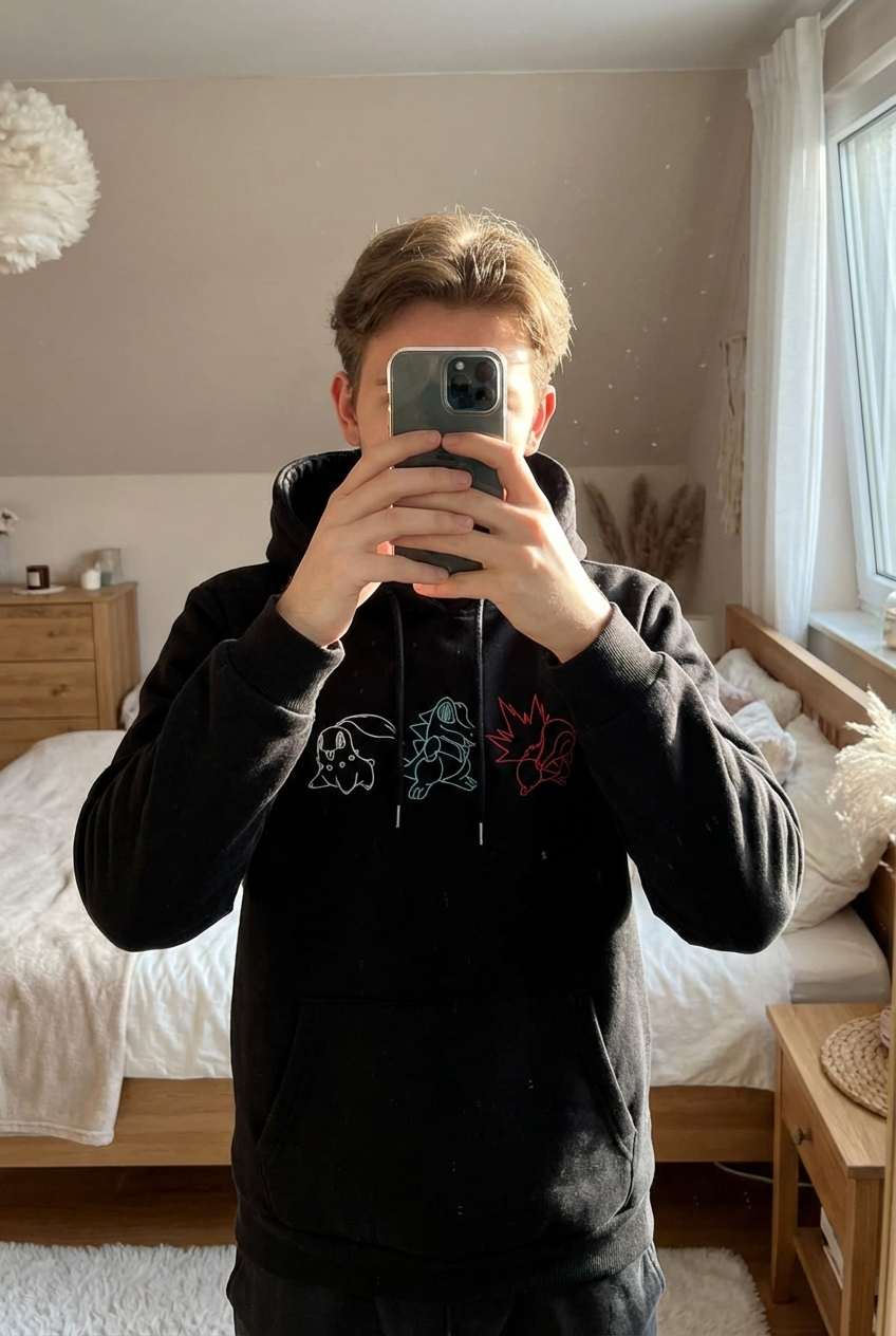Sweat à capuche debout, face à la caméra, dans une chambre à la lumière douce, avec une lumière naturelle filtrant par la fenêtre.