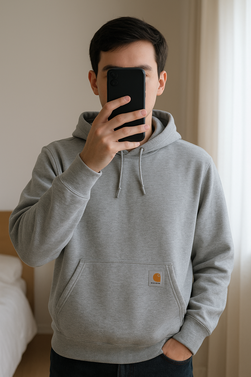 sweat à capuche Carhartt Taille L debout, face à la caméra, dans une chambre à la lumière douce, avec une lumière naturelle filtrant par la fenêtre.