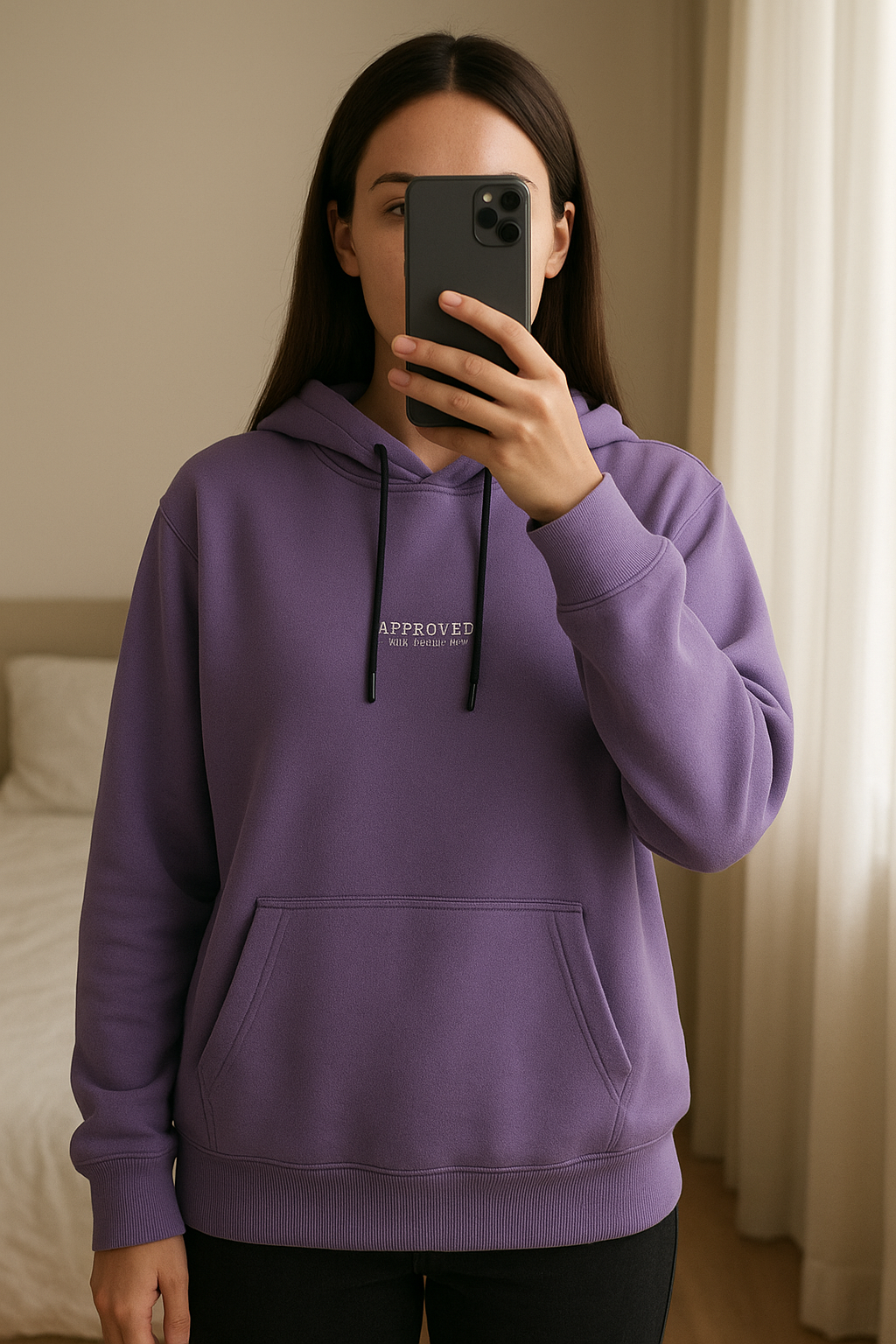 Sweat à Capuche Daily Aesthetikz mauve – Taille M debout, face à la caméra, dans une chambre à la lumière douce, avec une lumière naturelle filtrant par la fenêtre.