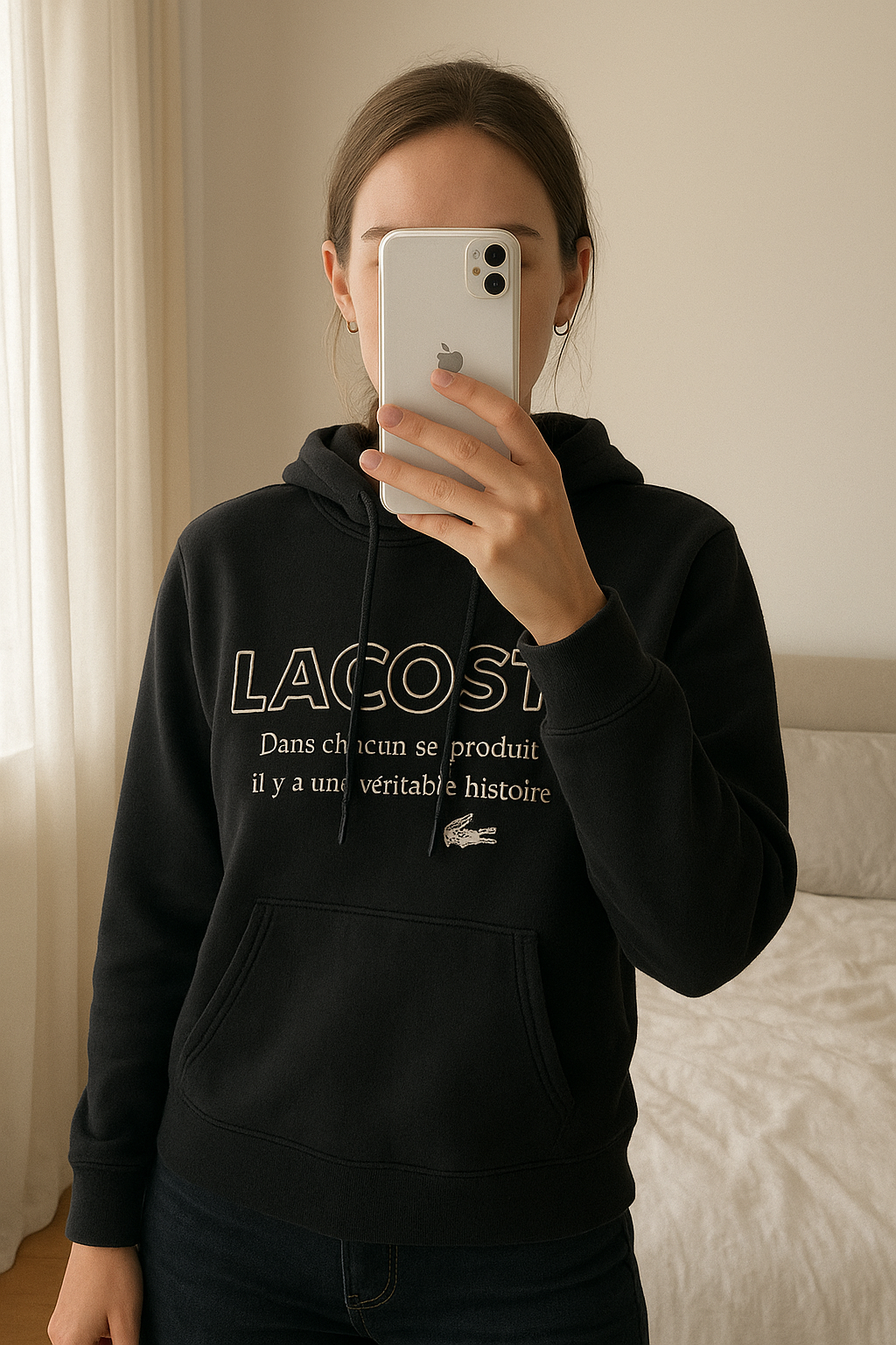 Sweat à capuche Lacoste debout, face à la caméra, dans une chambre à la lumière douce, avec une lumière naturelle filtrant par la fenêtre.