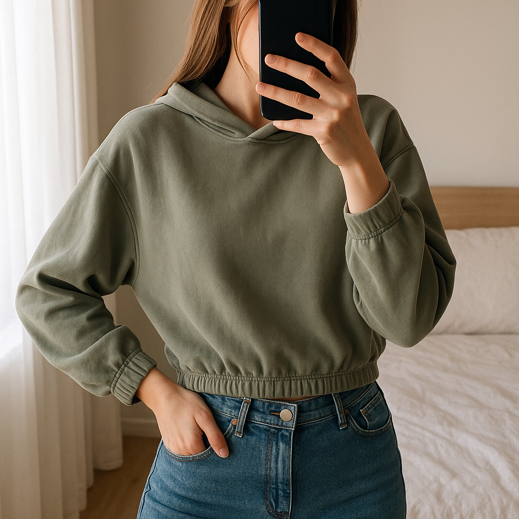 Una persona in Sweat à capuche Zara M - felpe Zara donna M inarcando leggermente la schiena per una posa dinamica, in una camera da letto con luce soffusa e luce naturale che filtra dalla finestra.