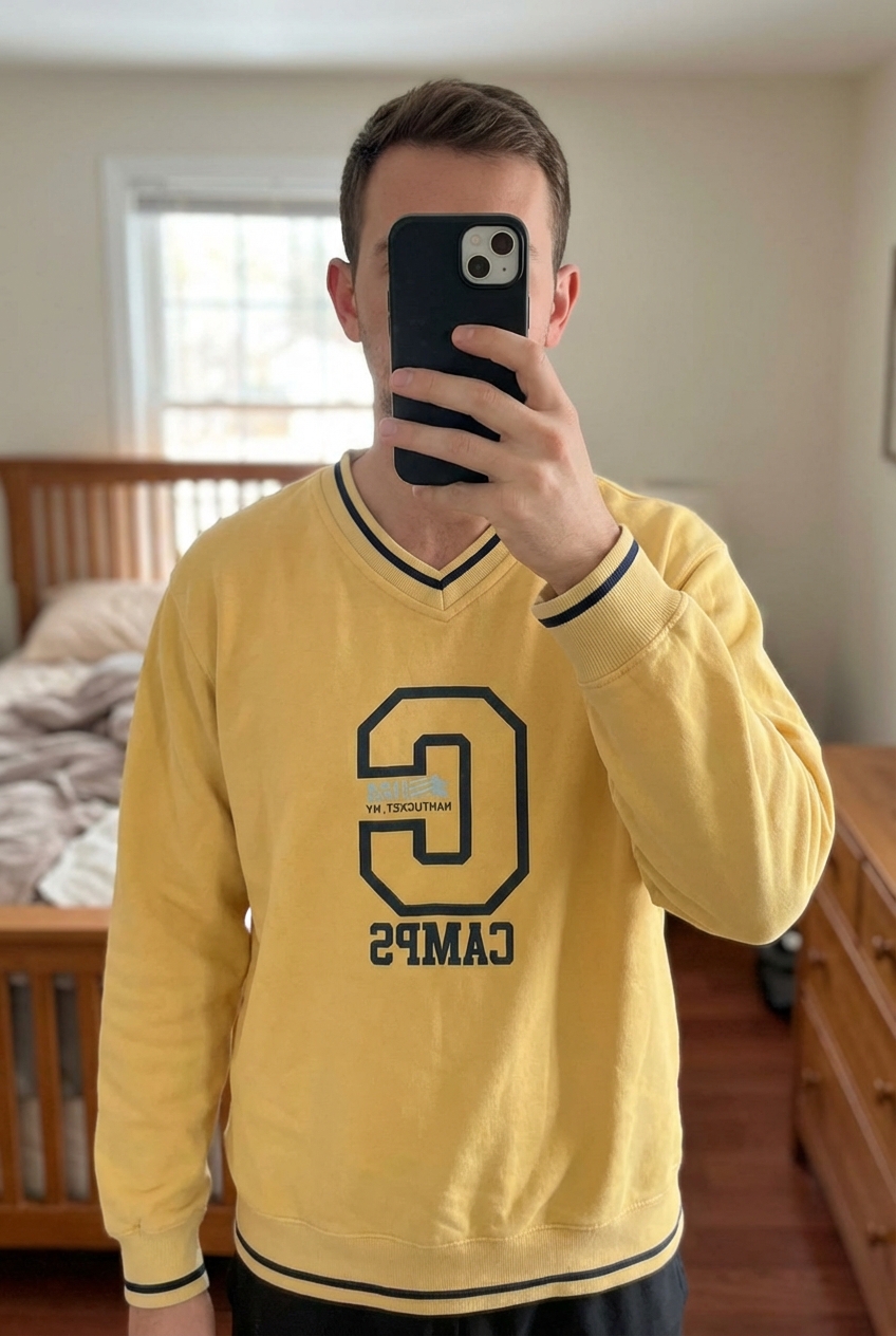 sweat jaune debout, face à la caméra, dans une chambre à la lumière douce, avec une lumière naturelle filtrant par la fenêtre.