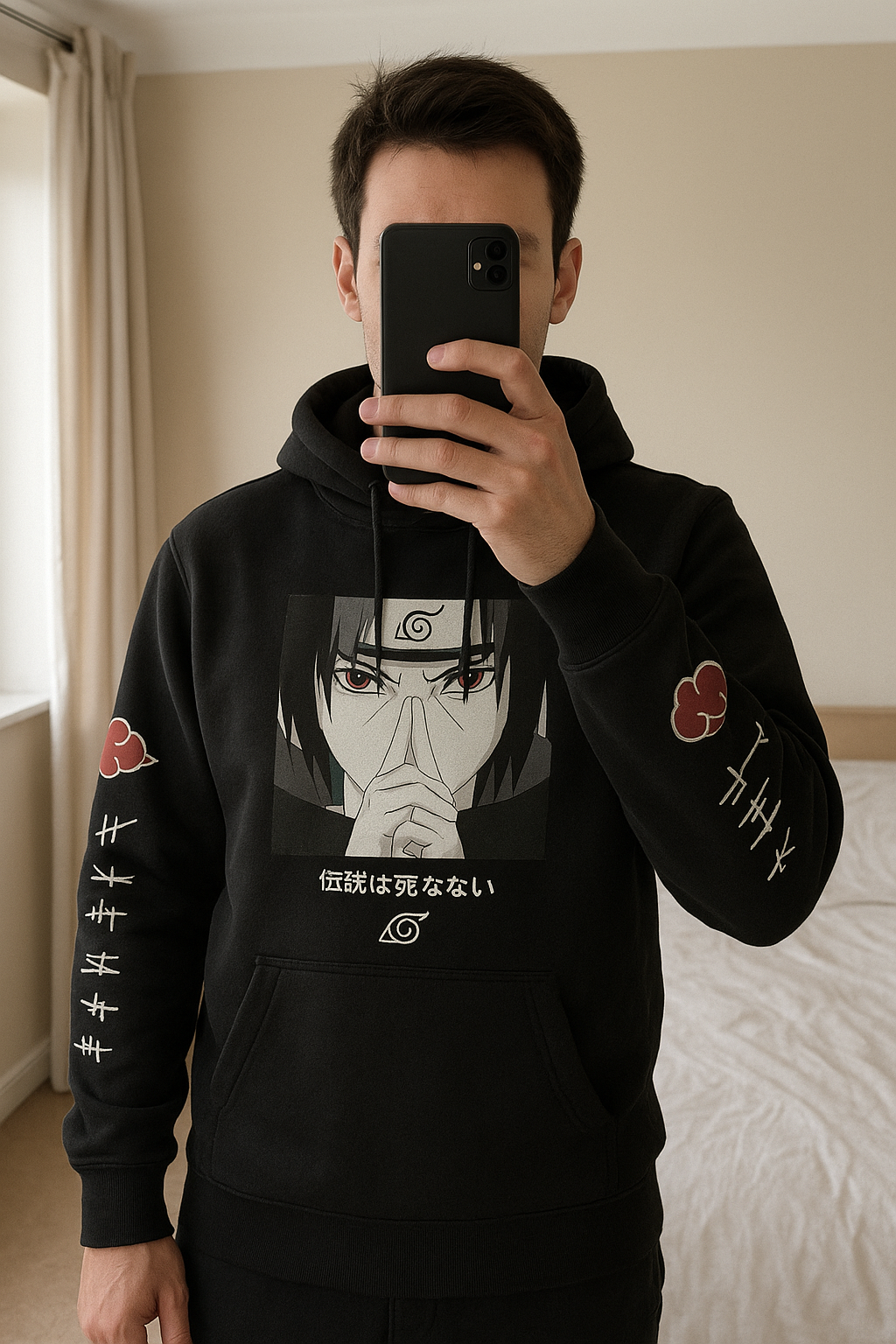 Sweat Naruto xl debout, face à la caméra, dans une chambre à la lumière douce, avec une lumière naturelle filtrant par la fenêtre.