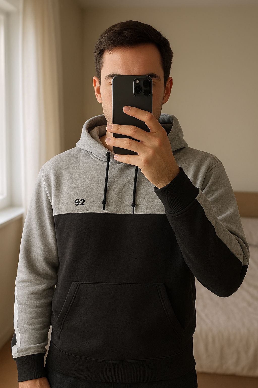 Sweat-shirt a capuche debout, face à la caméra, dans une chambre à la lumière douce, avec une lumière naturelle filtrant par la fenêtre.