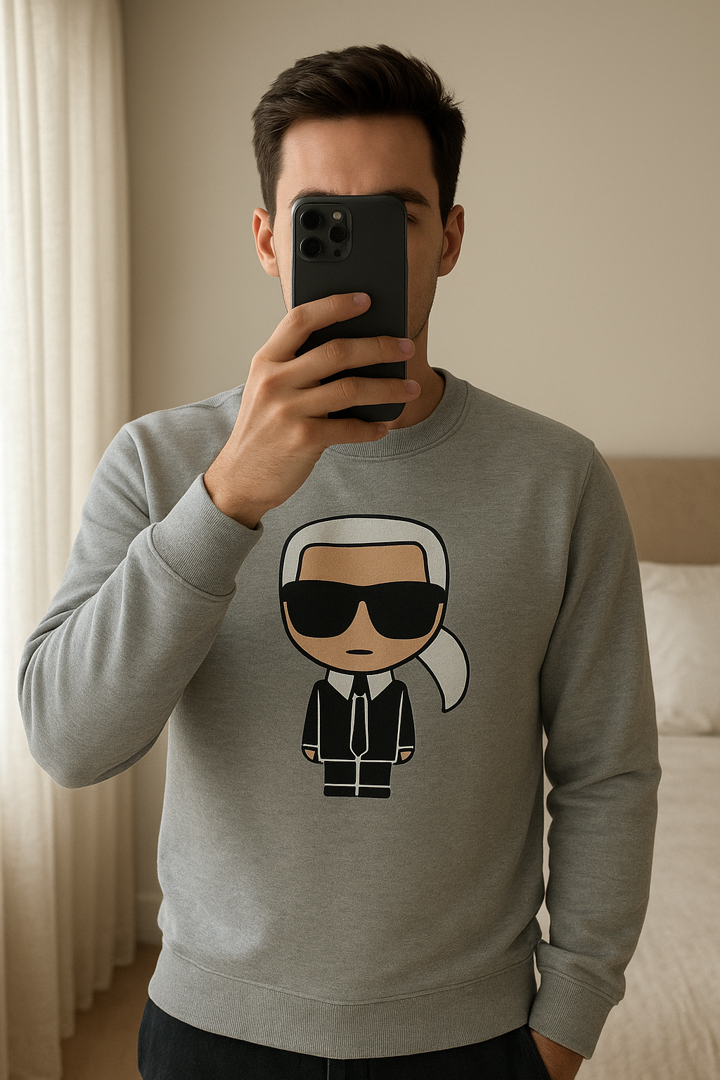 Sweat-shirt Karl Lagerfeld homme L gris debout, face à la caméra, dans une chambre à la lumière douce, avec une lumière naturelle filtrant par la fenêtre.