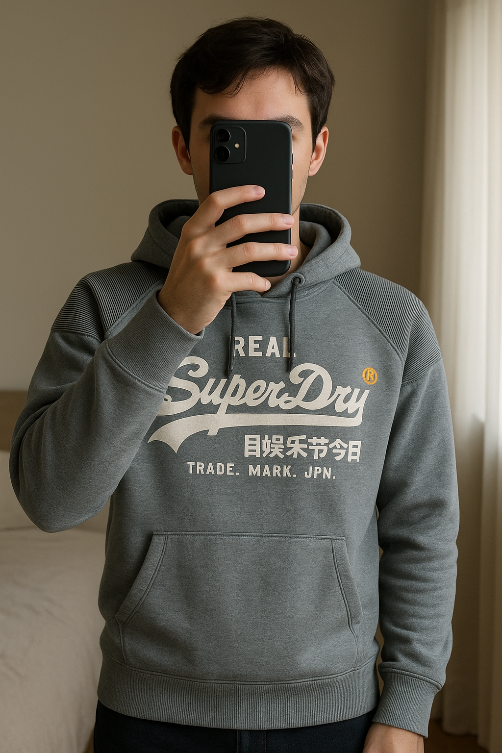 Sweat Superdy taille M en très bon état debout, face à la caméra, dans une chambre à la lumière douce, avec une lumière naturelle filtrant par la fenêtre.