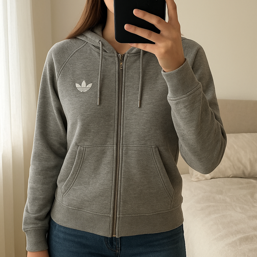 Sweat zippé Adidas femme gris hoodie capuche streetwear 1 - AI-powered image generator for Vinted