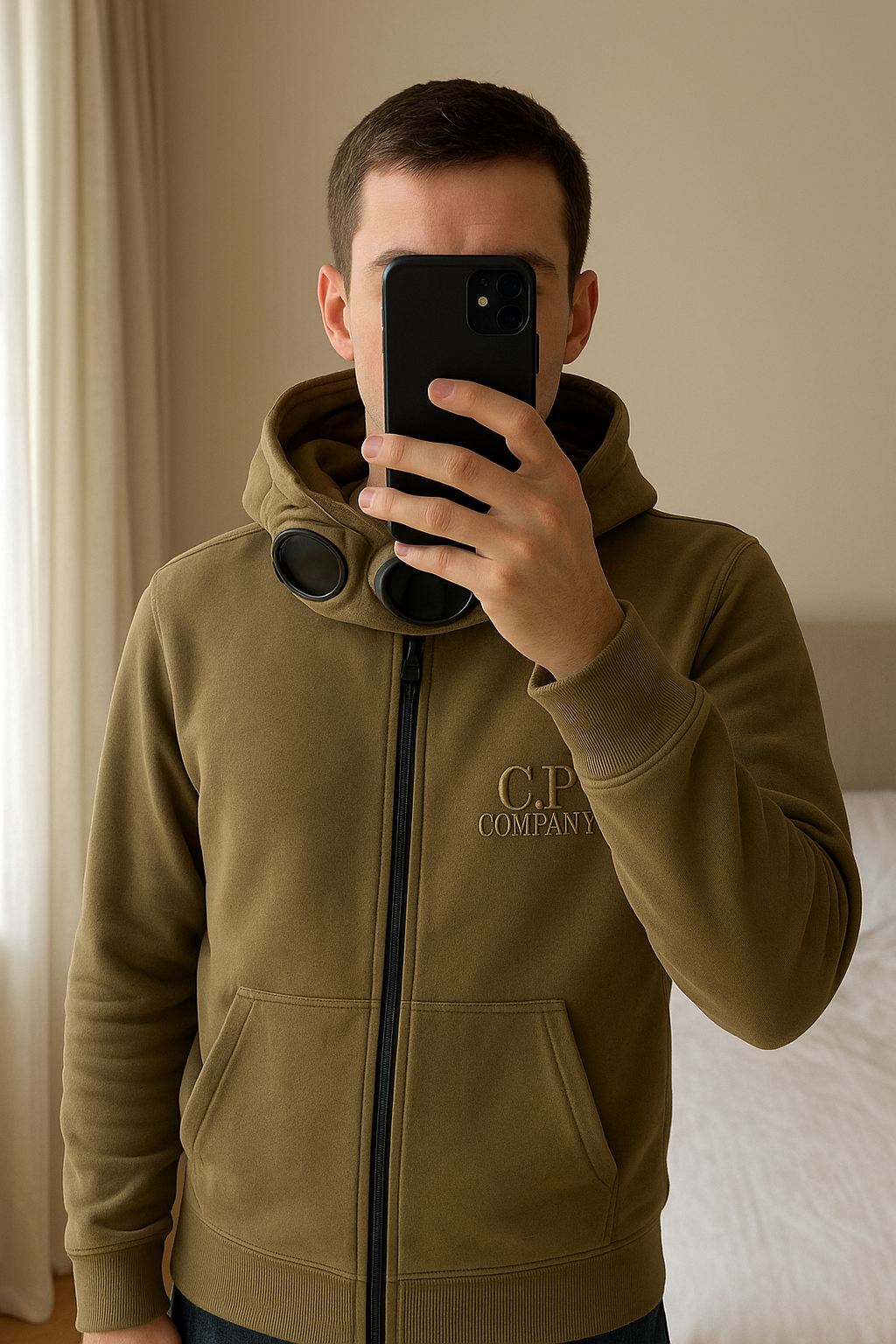 Sweat Zipper CP company kaki taille XL debout, face à la caméra, dans une chambre à la lumière douce, avec une lumière naturelle filtrant par la fenêtre.